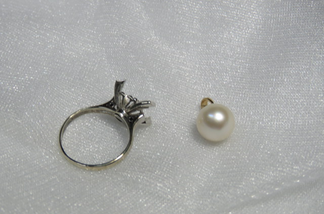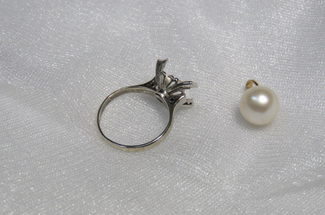 大きな真珠の指輪と立て爪のダイヤの指輪